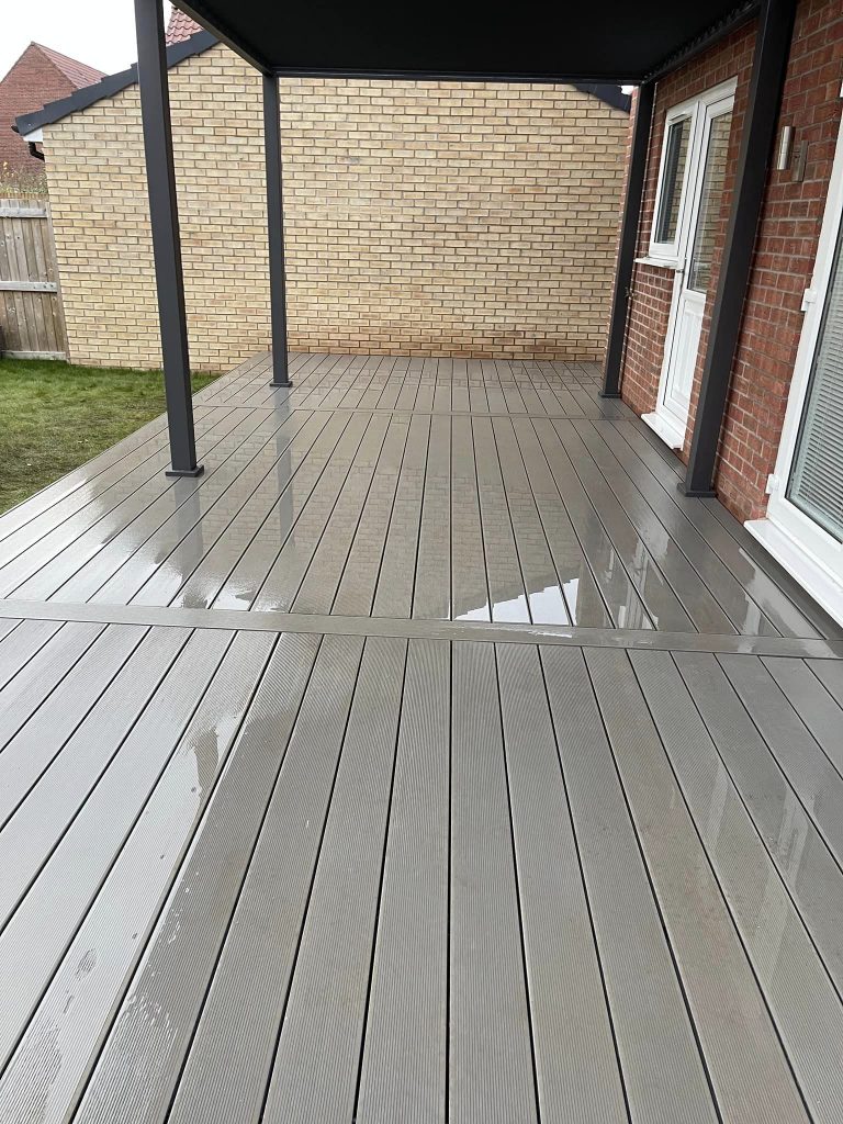 9.2m x 3.6m composite decking . Topped off with a 6m x 3m Pergola with electric operated louvers and LED lighting. Completed this week in Scalby Scarborough. Composite decking provided by Eurocell.